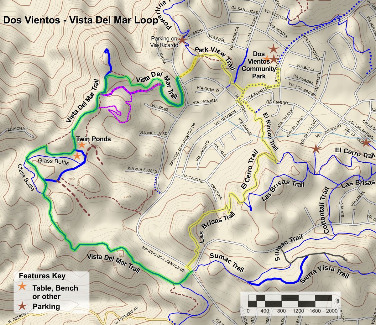• The Vista Del Mar Trail is a segment of the 2026 Conejo Open Space Challenge (https://cosf.org/challenge; colored green on the map below).