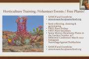 Antonio took us on a whirlwind tour of the native plants that exist in the Conejo, as well as how to best determine which plants are best suited for planting in our suburban gardens. He offered lively and fun and sage tips on soils, water needs, and his favorite local native plants. When Antonio becomes Governor, he will make the toyon California’s official plant! Antonio offers weekly classes on native plants; sign up at https://www.samofund.org/. Antoniio’s presentation starts at 50:03 minutes into the video below.