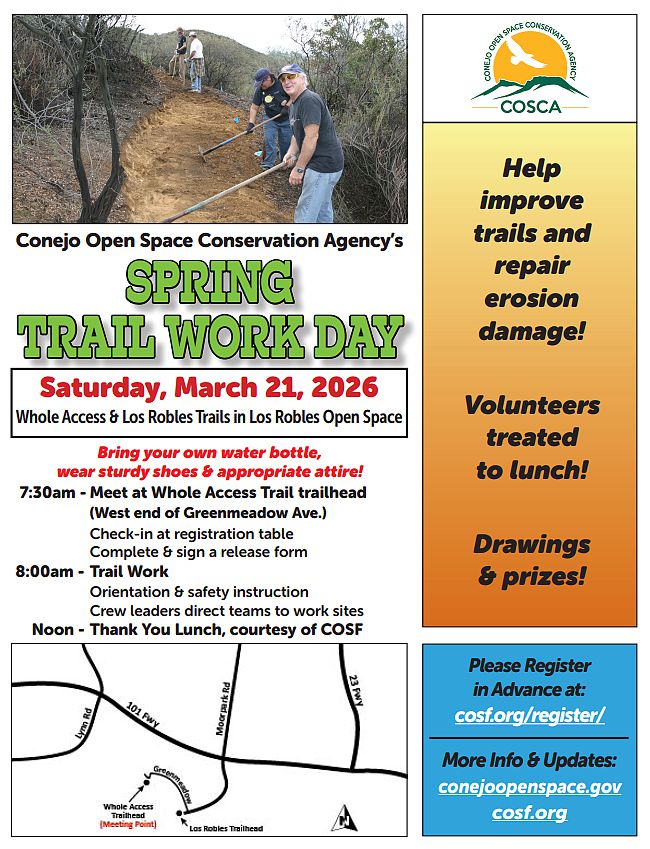 Come out to help fix up our amazing trails on Saturday, March 21, when the Conejo Open Space Conservation Agency rangers will host the Annual Spring Trail Work Day! The work will be on the Whole Access and Los Robles Trails. The thank-you lunch and gift give-away for volunteers at noon are courtesy of COSF. Please register online so we will know how many people to prepare for!