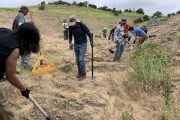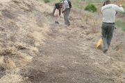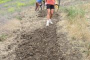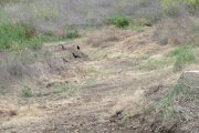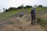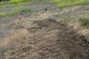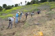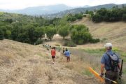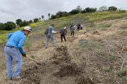 On May 18, about 25 volunteers worked to restore the Glider Hill South Trail that disappeared years ago under rapidly growing vegetation. A few days previously as a fire prevention measure, the neighboring homeowners had plowed down most of the grass and chaparral of the meadow through which the trail used to run, then the COSCA rangers mowed the old trail bed and flagged it. It was up to the volunteers to clean it up by using hand tools to remove all the remaining brush, most of which consisted of grass that was determined to stay rooted. When the bare dirt was exposed, they then dug into the hillside to reduce the slope across the trail. The volunteers were so exuberant that the work was completed well before the scheduled time of noon. They had restored about 2/3 of the 400-yard-long trail.