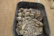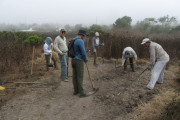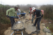 About 50 yards closer to the parking area, another group worked on a drainage lens. A drainage lens is where the trail is raised about 8 to 10 inches to make it higher than the surrounding swampy area. The bottom of the lens is composed of large rocks with gaps between them such that water can flow through the lens from one side to the other. On top of these large rocks are smaller rocks and then decomposed granite to make a smooth trail surface. The problem was that the small rocks and DG had fallen into the gaps between the large rocks, plugging it and so keeping water from being able to cross from one side to the other. This group worked on digging about 15 feet of the lens out, for repair or replacement at a later date. Here are the photos: