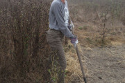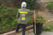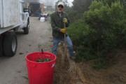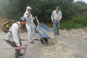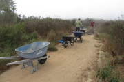 The September 28 trail work day took place at the Rancho Potrero Open Space, just south of Dos Vientos, and coincided with National Public Lands Day. Participants were given a one-day pass to federal lands, valid for a whole year! Volunteers worked on three separate projects: reconstructing a drainage lens, building a drain at a low point in the trail, and trimming brush around the parking area. These projects will be described in more detail below along with their separate photo galleries.