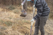 Furthest from the parking area, but still only about a 2-minute walk, one group worked on digging out a new drain where water pools in a low spot in the trail. That involved scraping all the grass off the area where the water was to run to, and then digging out the dirt to lower the drainage by a couple of inches so the water would flow off the trail. Finally, the downslope side of the trail had to be dug down below a slight depression that ran along the middle of the trail. You can see the volunteers working on this project in this gallery of photos.