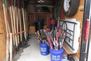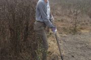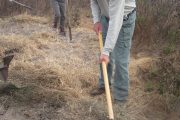 Furthest from the parking area, but still only about a 2-minute walk, one group worked on digging out a new drain where water pools in a low spot in the trail. That involved scraping all the grass off the area where the water was to run to, and then digging out the dirt to lower the drainage by a couple of inches so the water would flow off the trail. Finally, the downslope side of the trail had to be dug down below a slight depression that ran along the middle of the trail. You can see the volunteers working on this project in this gallery of photos.