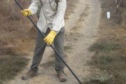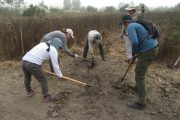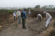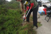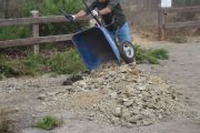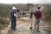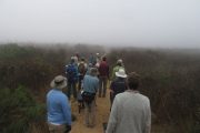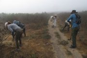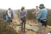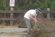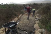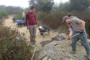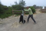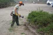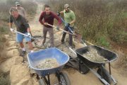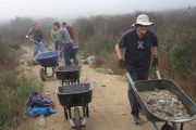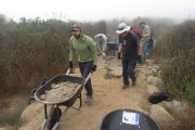 The September 28 trail work day took place at the Rancho Potrero Open Space, just south of Dos Vientos, and coincided with National Public Lands Day. Participants were given a one-day pass to federal lands, valid for a whole year! Volunteers worked on three separate projects: reconstructing a drainage lens, building a drain at a low point in the trail, and trimming brush around the parking area. These projects will be described in more detail below along with their separate photo galleries.