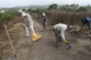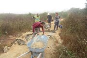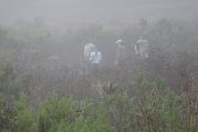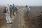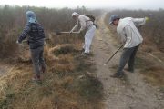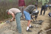 About 50 yards closer to the parking area, another group worked on a drainage lens. A drainage lens is where the trail is raised about 8 to 10 inches to make it higher than the surrounding swampy area. The bottom of the lens is composed of large rocks with gaps between them such that water can flow through the lens from one side to the other. On top of these large rocks are smaller rocks and then decomposed granite to make a smooth trail surface. The problem was that the small rocks and DG had fallen into the gaps between the large rocks, plugging it and so keeping water from being able to cross from one side to the other. This group worked on digging about 15 feet of the lens out, for repair or replacement at a later date. Here are the photos: